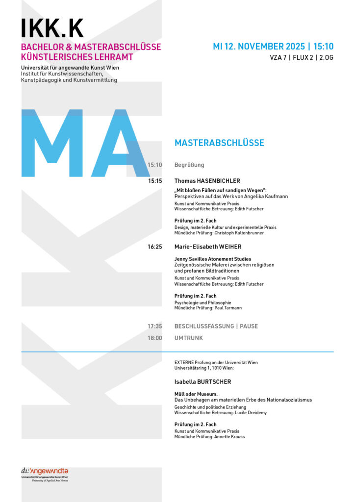 Eintrag // 01 JUN 2020 KOMMESSIONELLE PRÜFUNG MA & BA 2020_S 17 JUN 09:00-13:00 18 JUN 10:00-13:00 ZOOM Meeting, nach persönlicher Anmeldung an doris.muellner@uni-ak.ac.at ZOOM LINK per mail eine Woche vor Termin NUR an Anmeldungen BA_Prüfungen 17 JUN 2020