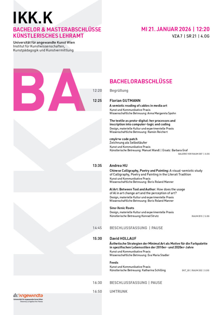 Eintrag // 15 SEP 2020 Vorschau in das Studienjahr 2020/21 !!! Alle Veranstaltungen müssen unter Einhaltung der verordneten Hygienvorschriften umgesetzt werden Bitte regelmäßig die Infos auf www.dieangewandte.at/covid19 abrufen