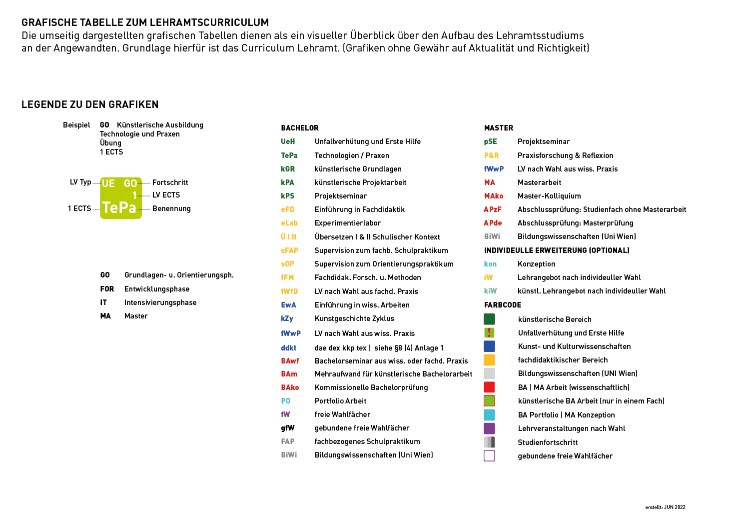 In dieser Darstellung steht für jeden im Curriculum vorgeschriebenen ECTS Punkt jeweils ein Kästchen. Die farbige Ausarbeitung ermöglicht einen Überblick über die Repräsentanz der „Säulen“ im Curriculum. Darüber wird zum Beispiel gut sichtbar, dass im Master-Curriculum (anders als im Bachelor-Curriculum) die künstlerisch-praktischen Anteile zugunsten der wissenschaftlichen Masterarbeit, der pädagogischen und bildungswissenschaftlichen Theorie und Praxis, der Schulpraxis und der Fachdidaktik stark zurücktreten.