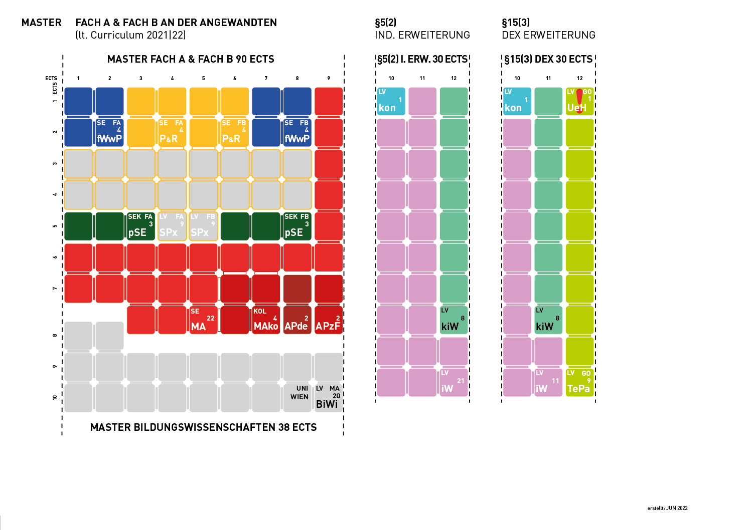BILD: grafische Darstellung des MASTER Curriculums mit den zwei Studienfächern. Die „Säulen“ sind farbig ausgewiesen: